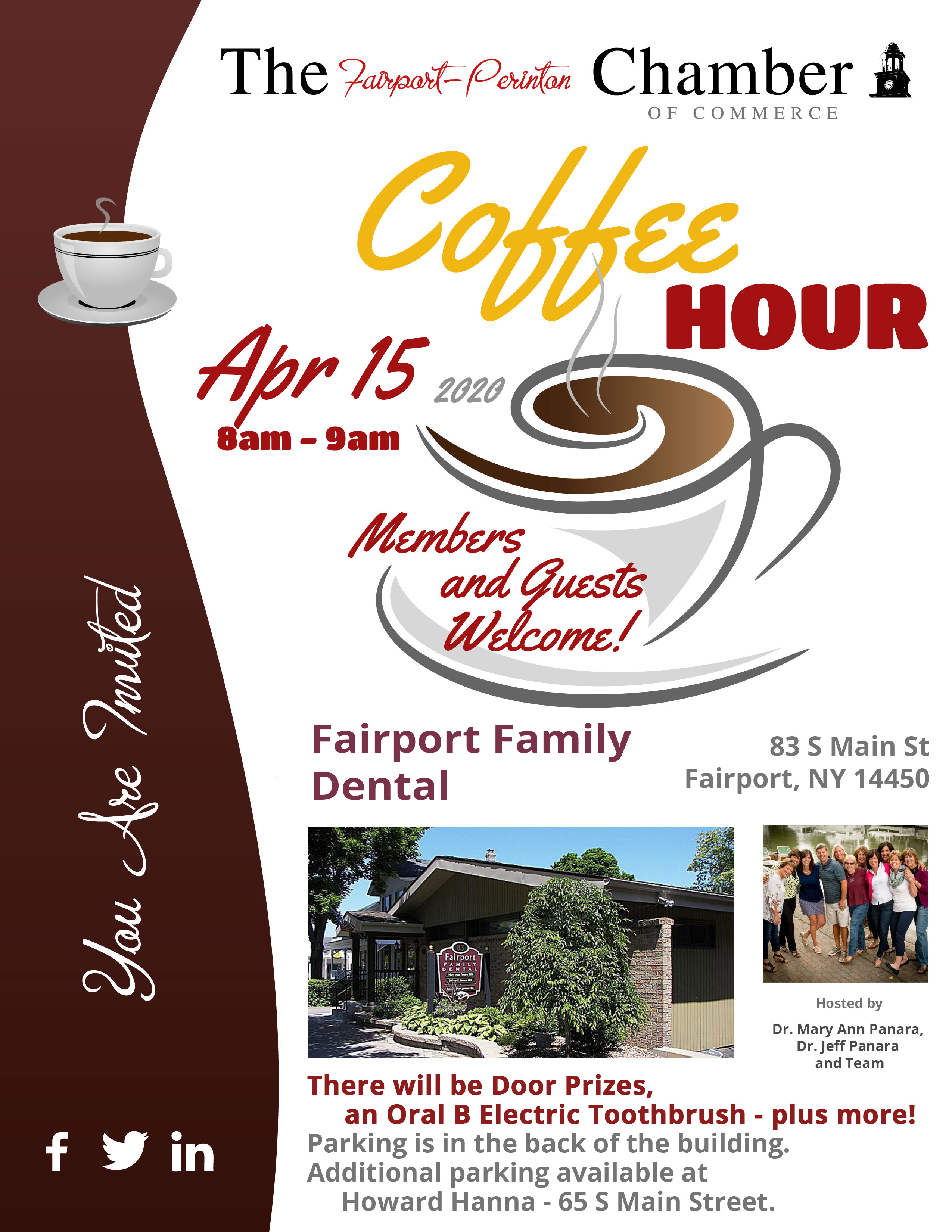 You are invited to a coffee hour at Fairport Family Dental! The event is hosted by Dr. Mary Ann Panara, Dr. Jeff Panara, and Team.