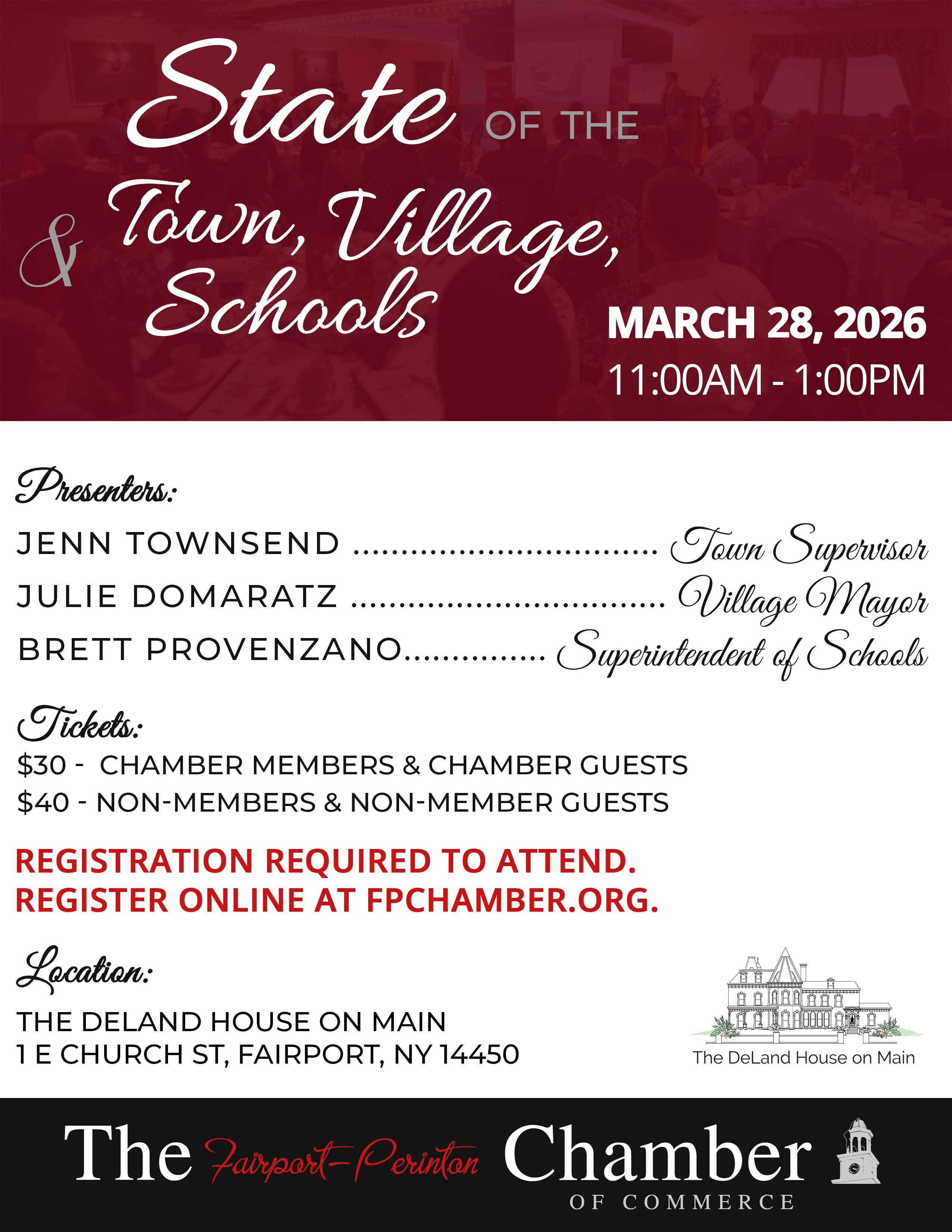 The Fairport Perinton Chamber of Commerce presents the State of the Town, Village, and Schools.  Speakers include Jenn Townsend (Perinton Town Supervisor), Julie Domaratz (Fairport Village Mayor), and Brett Provenzano (Fairport Superintendent of Schools).